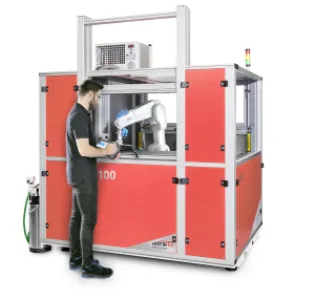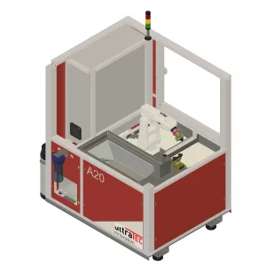 The machine impresses with its compact design and comes with 2 drawers for automated component feeding. A 6-axis industrial robot for component handling stands on a welded steel machine bed, which is partially filled with mineral concrete. This gives the machine maximum stability. The housing is made of high-quality aluminium profiles.